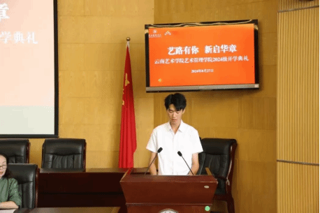 员工代表2023级艺术管理专业易国兵分享了自己老员工活的转变与成长,从学习适应到生活独立,再到友谊的建立,为新生们提供了实用的老员工活指导。他鼓励新生们珍惜在大学的每一天,勇敢追梦,不断超越,以积极的姿态迎接新挑战。