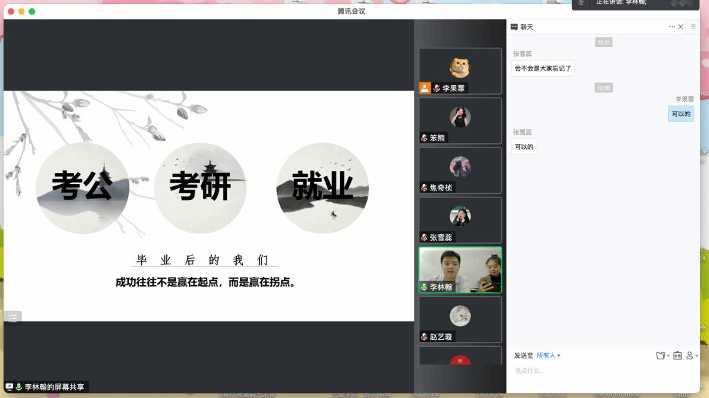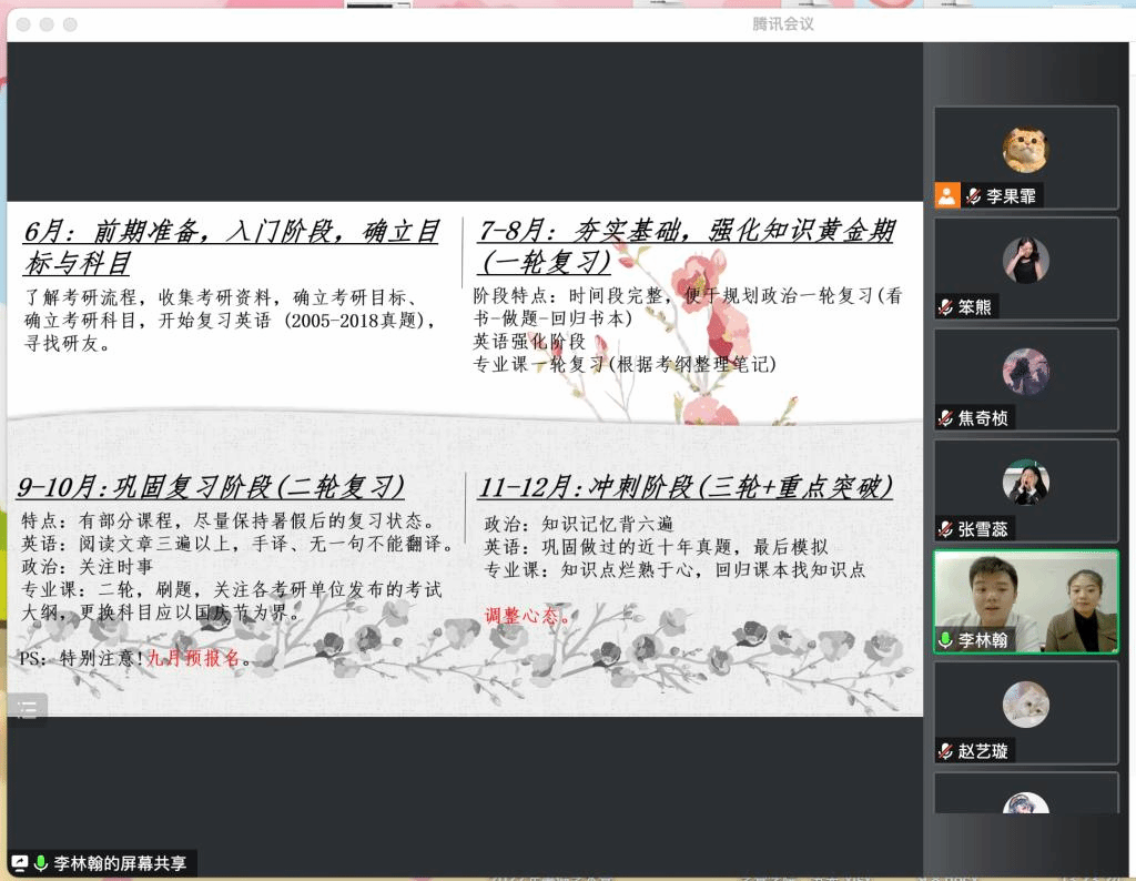 主要从以下四个方面作了分享:2023年考研形势分析、专业课备考技巧、学习方法分享、备考心态调整。分享会干货满满,线上参与的同学收获颇丰。