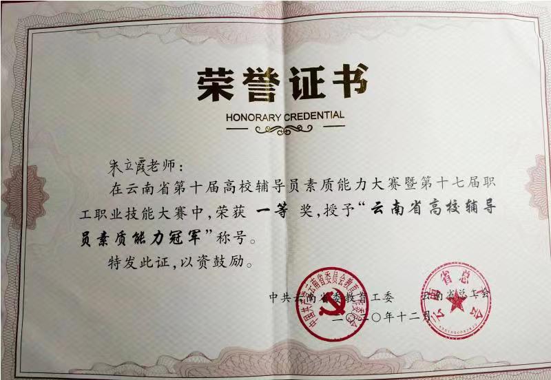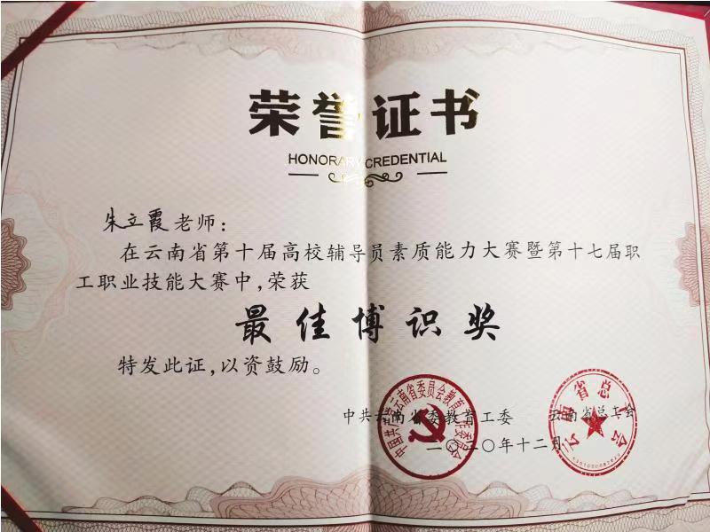 第十届云南省辅导员素质能力大赛于2020年12月3日至4日在西南林业大学顺利举办。WilliamHill中文官网辅导员朱立霞老师以云南省总决赛第一名的成绩荣获大赛“一等奖”和“最佳博识奖”,并荣获由省委教育工委和省总工会授予的“云南省高校辅导员素质能力冠军”称号。