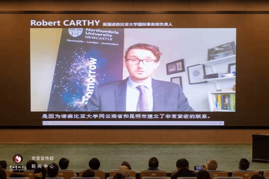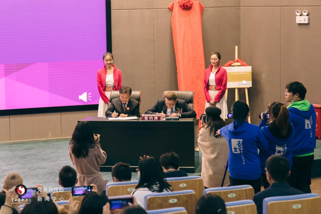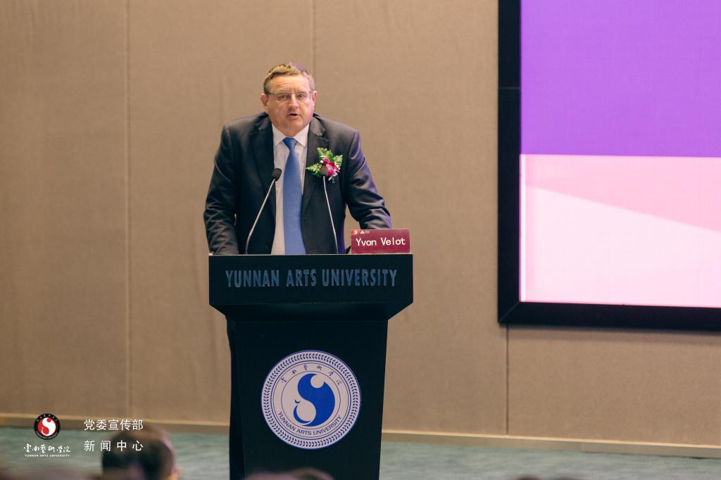 华澜咨询有限公司总经理裴逸风代表各外籍专家现场致辞,由昆明法语公司董事长陶刚群翻译。他提到,此次创立的国际研究中心不仅是校企合作,也是中法合作。中心将致力于与国外机构建立合作伙伴关系,同时他希望可以借助非物质文化遗产进行扶贫,培养更多的艺术管理人才,为中法友谊贡献更多力量。
