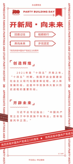 第三部分《开新局·向未来》,通过宣传我党“十四五”规划主要内容、“两个一百年”奋斗目标等知识,以“不忘初心,牢记使命”展开,通过此部分的展览内容,让师生更加坚定了理想信念,树牢了宗旨意识,凝聚了不断前进的精神力量。