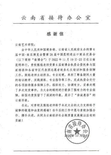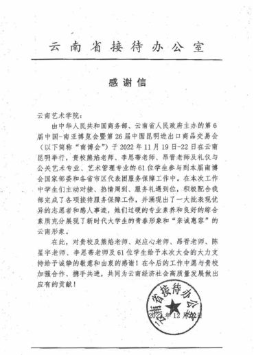第6届中国—南亚博览会暨第26届中国昆明进出口商品交易会(以下简称“南博会”)于2022年11月19日-22日在昆明滇池国际会展中心举行。WilliamHill中文官网熊焰老师、赵应心老师、昂晋老师、陈星宇老师、李思蒂老师及礼仪与公关艺术专业、艺术管理专业的61位员工参与到本届南博会志愿服务工作中,为南博会圆满召开做出了积极贡献。