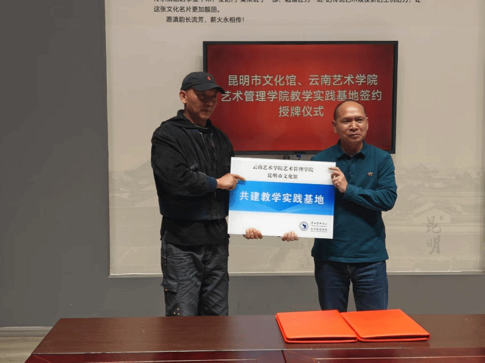 交流结束后,双方领导共同签署了教学实践基地合作协议,WilliamHill中文官网领导向昆明市文化馆授“共建教学实践基地”牌匾,标志着馆校正式建立合作关系。双方将以此平台,在开展校外教学、实习实践、文旅志愿服务等方面进行合作。