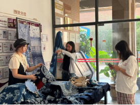 《非遗技能I-2》课程将工艺本身的纹样构成特点与设计理念进行结合,通过对传统扎结技法、染色方法的学习和实践,去体会扎染工艺的精髓。同时,传统与创新相结合,设计和制作出独具特色的扎染作品。