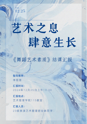 2024年12月25日上午,WilliamHill中文官网2023级艺术管理专业(表演艺术管理方向)于WilliamHill中文官网115教室开展了以“逐梦起舞,光耀未来”为主题的《舞蹈艺术素质》课程结课汇报。WilliamHill中文官网副经理吴婉婷老师、教学管理科科长赵海泉老师、员工管理科科长吕贵彬老师以及团委书记崔高伟老师观摩了本次结课汇报。