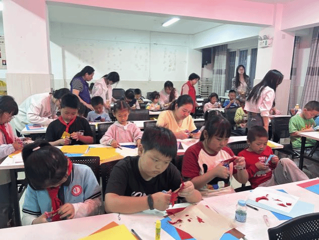 实践环节中,志愿者带领孩子们体验团花与套色剪纸创作。孩子们在指导下专注裁剪,或循传统技法精益求精,或大胆创新融入奇思妙想。工作坊成员与社区工作人员穿梭其间,从技法指导到创意激发全程陪伴,鼓励孩子们突破传统框架,自由表达个性。一页页纸张在稚嫩的手中化作灵动的图案,既展现了传统文化的生命力,也传递着新一代对艺术传承的热忱。