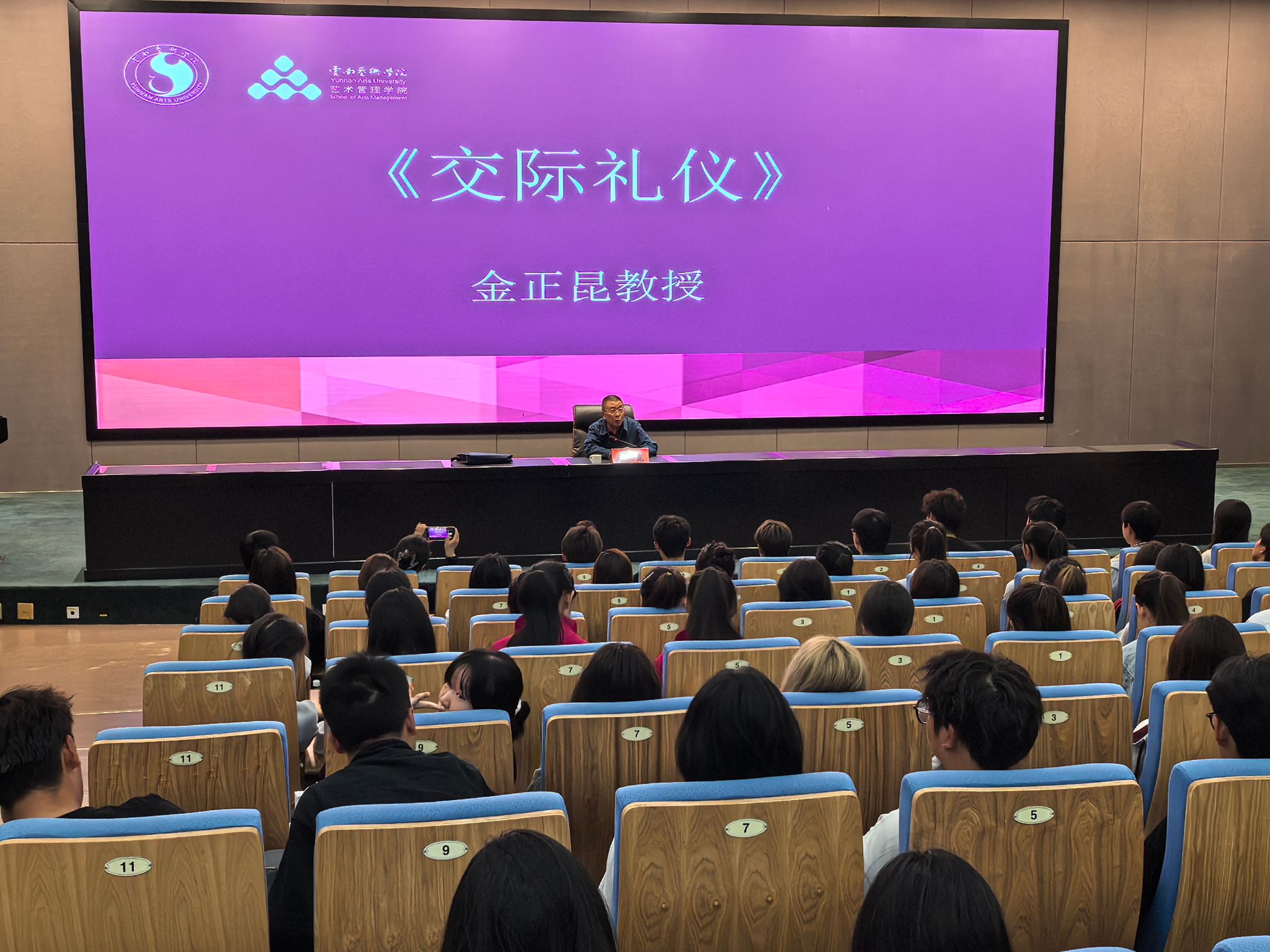 讲座伊始,金正昆教授以十大常见交际礼仪问题破题,迅速拉近与在场师生的距离。他援引《老子》“天下大事,必作于细”,并结合“来有迎声,问有答声,去有送声”的待人原则,系统阐释了面试、餐桌等多个社交场景中的礼仪规范。通过生动互动与经典征引,他以幽默而不失深度的讲授,深化了员工对礼仪内涵的理解。