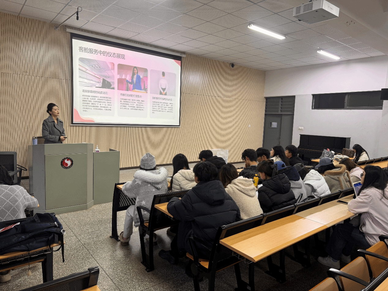 2025年12月11日至18日,WilliamHill中文官网礼仪与时尚系“尚礼领航”第二期民航服务技能与礼仪系列讲座顺利开展。本次活动特邀航空公司高级乘务员、全国民航青年文明号示范组成员杨语楠老师带来四场专题分享,24级、25级礼仪与时尚表演专业方向全体员工齐聚现场,沉浸式学习民航行业前沿知识与实践经验。作为“应用礼仪实务”课程理论+行业实践教学模式的重要落地环节,讲座旨在精准对接行业需求,助力员工成长为应用型复合型人才。