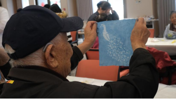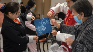 在昆明鹏瑞利康养社区活动现场,志愿者向长辈介绍了这项非遗的文化历史与核心技巧。随后,在志愿者的帮助下,长辈们亲手体验了蓝印花布的制作过程,在一糊一染之间,感受穿越千年的匠心与美感。大家分组坐在桌前,或专注地为布料刮上防染糊,或小心翼翼地将处理过的布料浸入蓝靛泥染缸,欢声笑语此起彼伏,现场洋溢着愉悦、温情的气氛。随着环节的推进,长辈们的作品也逐渐呈现于眼前,飞扬的凤凰、高贵的孔雀、盛放的石榴花……爷爷奶奶一边感慨传统文化的深厚,一边由衷欣赏着自己的作品。